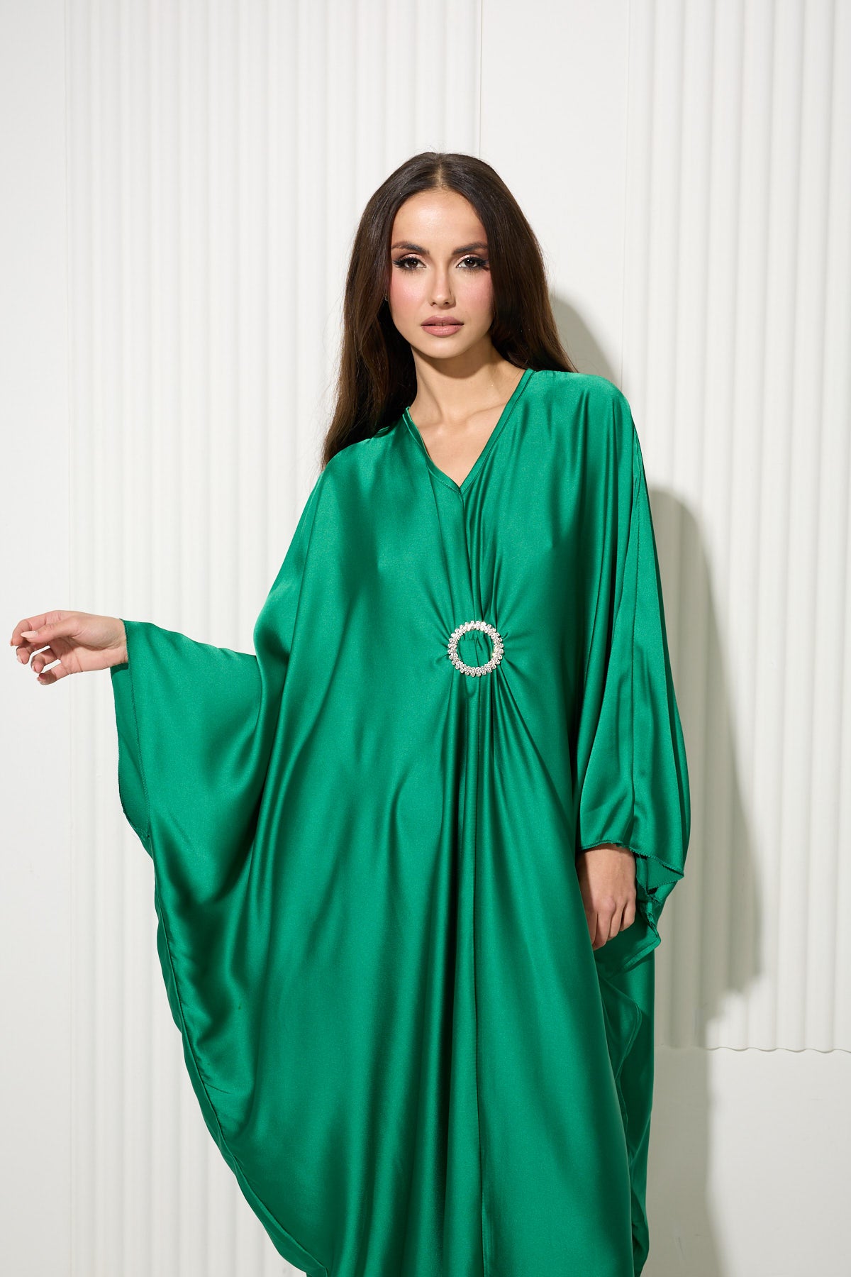 Taupe Dress with Attached Cape and Pearl Trim Detail
